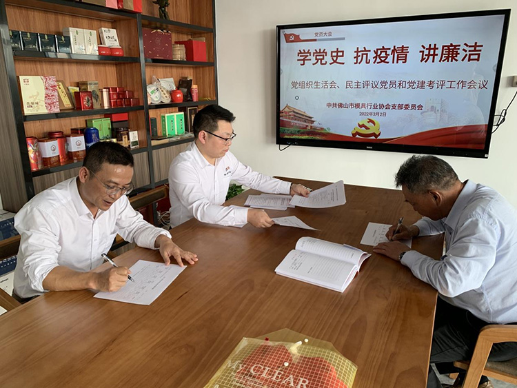 2022年3月2日下午在中共佛山市模具行業協會支部委員會在廣東思豪內高壓科技有限公司召開“學黨史、抗疫情、講廉潔”——黨組織生活會、民主評議黨員和黨建考評工作會議,此次會議由協會黨支部書記饒學高同志主持,全體黨員出席會議。