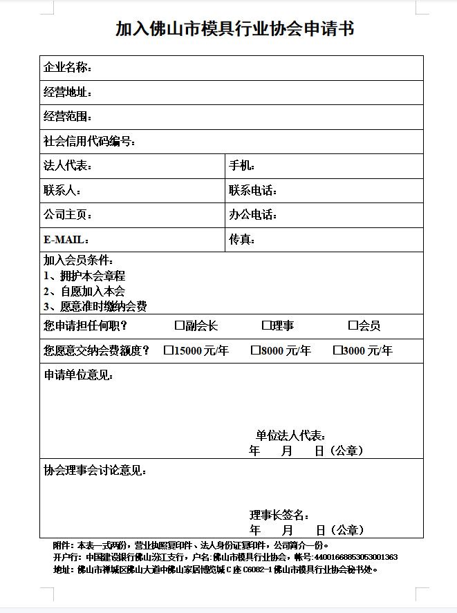1.欲加入佛山市模具行業(yè)協(xié)會(huì)的單位,應(yīng)由法人代表或委托人向協(xié)會(huì)秘書處申領(lǐng)入會(huì)申請(qǐng)表。