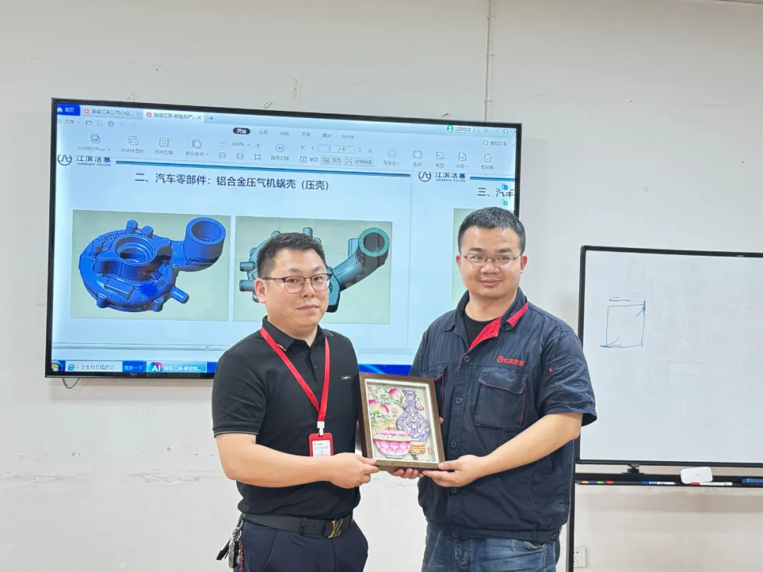 該公司目前開發了一些新能源汽車高壓和低壓壓鑄模具,與本次考察團成員企業高度吻合,就技術上和業務上展開了深入的交流和探討,并對北京精雕的設備加工技術和解決方案產生了濃厚的興趣。