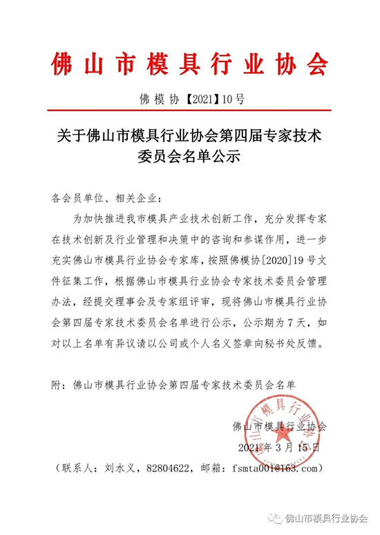 為加快推進我市模具產(chǎn)業(yè)技術(shù)創(chuàng)新工作,充分發(fā)揮專家在技術(shù)創(chuàng)新及行業(yè)管理和決策中的咨詢和參謀作用,進一步充實佛山市模具行業(yè)協(xié)會專家?guī)欤凑辗鹉f(xié)[2020]19號文件征集工作,根據(jù)佛山市模具行業(yè)協(xié)會專家技術(shù)委員會管理辦法,經(jīng)提交理事會及專家組評審,現(xiàn)將佛山市模具行業(yè)協(xié)會第四屆專家技術(shù)委員會名單進行公示,公示期為7天,如對以上名單有異議請以公司或個人名義簽章向秘書處反饋。