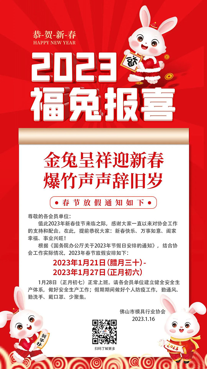 【喜迎兔年】佛山市模具行業(yè)協(xié)會(huì)春節(jié)放假通知,恭祝大家兔年大吉,錢兔似錦!