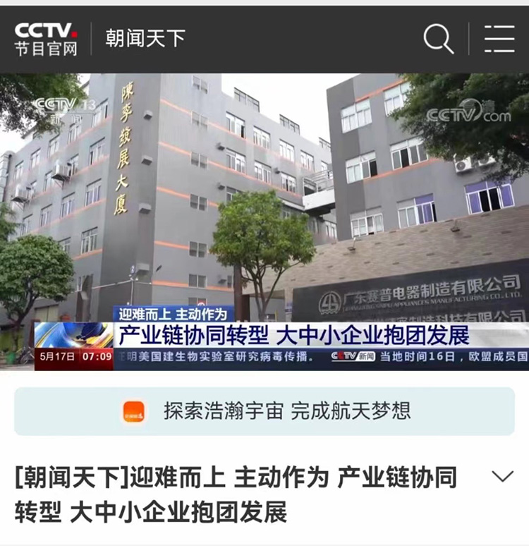 5月17日,佛山市模具行業(yè)協(xié)會(huì)會(huì)員單位 廣東賽普電器制造有限公司 亮相央視節(jié)目【朝聞天下】時(shí)政要聞,內(nèi)容報(bào)道寫(xiě)道:賽普電器是一家生產(chǎn)洗碗機(jī)配套零件的工廠,不久前受疫情影響,大量的產(chǎn)品生產(chǎn)出來(lái)無(wú)法交付,導(dǎo)致庫(kù)存積壓嚴(yán)重、經(jīng)營(yíng)困難。這時(shí),一家家電龍頭企業(yè)為他們提供了一套云端數(shù)控平臺(tái)。