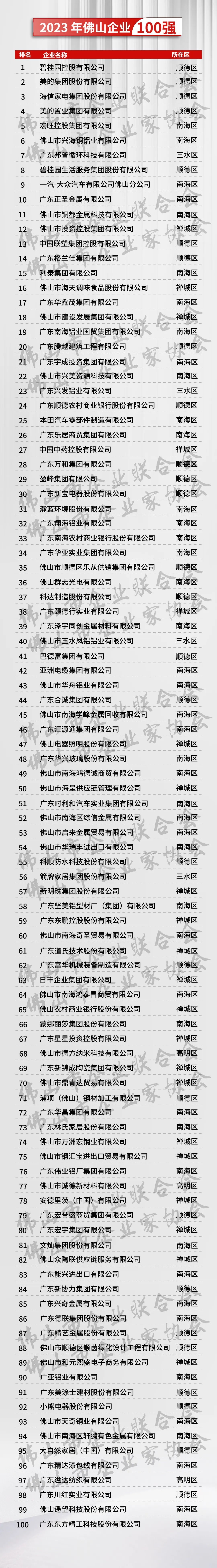 佛山制造業企業100強