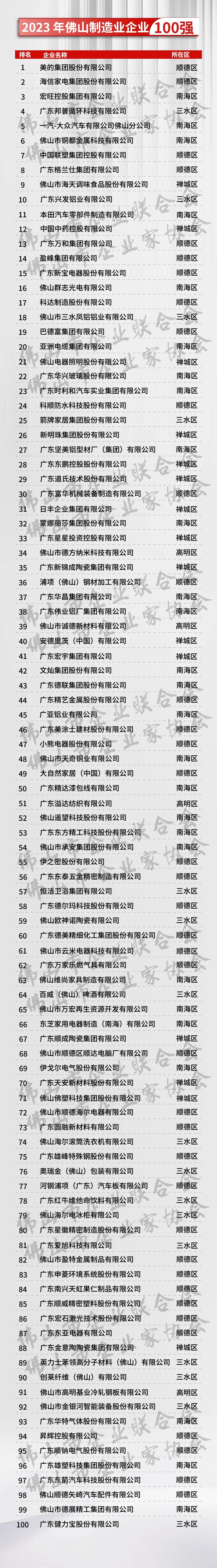 7家企業上榜2023年佛山制造業企業100強,分別是:廣東萬和集團股份有限公司、廣東新寶電器股份有限公司、佛山群志光電有限公司、文燦集團股份有限公司、廣東雄峰特殊鋼股份有限公司、廣東順威精密塑料股份有限公司、廣東東亞電器有限公司。
